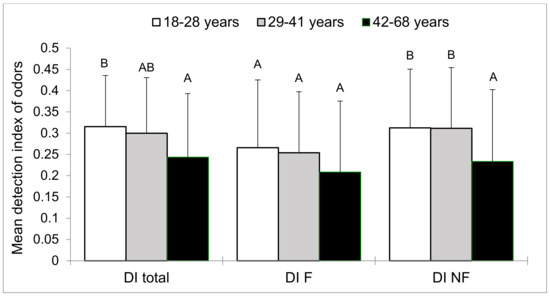 Between-age groups comparison of mean detection indices of odors (all odors: DI total; only familiar odors: DI F and only unfamiliar odors: DI NF). For each mean detection index of odors (all, familiar, or unfamiliar), values with the same letters are not significantly different at the 5% level of significance (Tukey test). Vertical bars indicate the standard deviation of the mean.