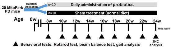 Experimental design for the identification of long-term effects of probiotic administration in MitoPark Parkinson’s disease (PD) mice (n = 20). Daily administration of probiotics was treated from the age of 8 weeks to 24 weeks in MitoPark PD mice. Behavioral tests, including rotarod, beam balance, and gait analysis, were performed every two weeks to test the time-course effects during treatment. Immunohistochemistry (IHC) analysis was applied at the age of 24 weeks to identify the neuroprotective effects on dopaminergic cells following probiotic intervention.