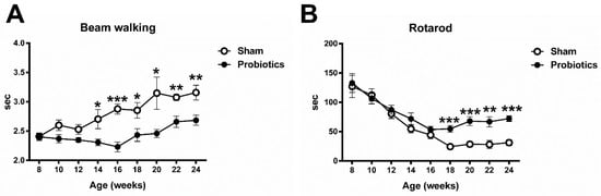 The present study used the beam walking and rotarod test to investigate the performance in balance function and motor coordination of the MitoPark mice with or without probiotic administration in different age stages. In the beam walking test, repeated measures ANOVA indicated significant main effects of group (F = 18.72, p = 0.001) and time (F = 8.25, p < 0.001) and a significant interaction with group × time (F = 2.59, p = 0.013). Post hoc t-tests between the two groups showed that time duration reached a significant difference at the age of 14 weeks (t = 2.31; p = 0.039), 16 weeks (t = 5.38; p < 0.001), 18 weeks (t = 2.48; p =0.029), 20 weeks (t = 2.42; p =0.032), 22 weeks (t = 3.89; p =0.002), and 24 weeks (t = 3.11; p = 0.01) (Figure 2A).