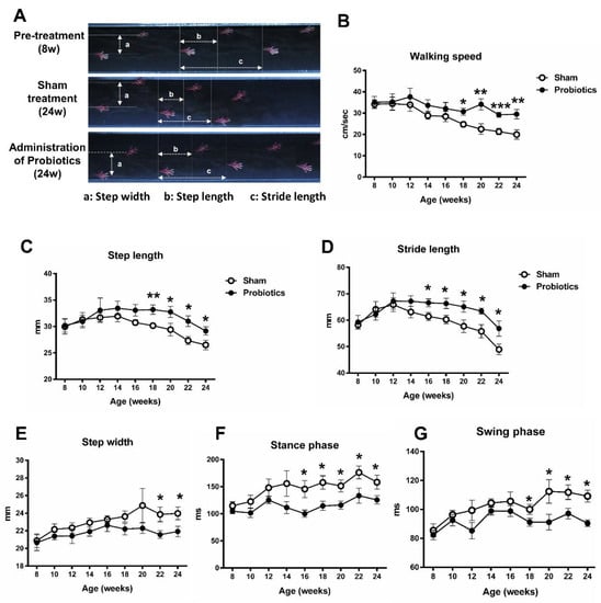 Characteristics of stepping footprints during a 2-sec walkway walking for an 8-week-old MitoPark PD mouse, a 24-week-old MitoPark PD mouse with non-probiotic treatment, and a 24-week-old MitoPark PD mouse with long-term probiotic treatment (A). Time-course changes in walking speed (B), step length (C), stride length (D), step width (E), stance phase time (F), and swing phase time (G) in the sham- and probiotic-treated PD mice over a 16-week observation period. The results showed that the gait function decreases significantly in the sham-probiotic-treated group but decreases less in the probiotic treatment group. * p < 0.05, ** p < 0.01, *** p < 0.001, significant difference between the two groups at each time point.