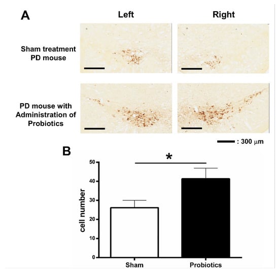 Representative tyrosine hydroxylase (TH) immunostaining in the substantia nigra pars compacta (SNpc) in PD mouse without probiotic treatment and in PD mouse with probiotic treatment (A). The average numbers of TH-positive neurons in the SNpc between sham treatment and probiotic-treated groups were compared (B). * p < 0.05 (unpaired t-test).