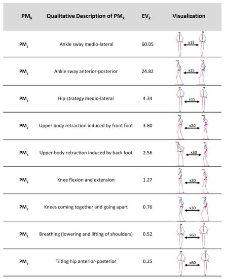 The first nine analyzed movement components explained 98.37% of the overall movement variance during the balancing trials. A video sequence, which can be found in the Supplementary Materials (Videos S1–S3), contains visualizations of these movement components. The extreme positions of each component along with the respective eigenvalues EVk and qualitative descriptions are presented in in Figure 1.