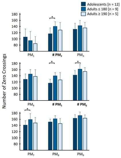 Visualization of the differences in “number of zero crossings” between adolescents (dark blue), adults smaller or equal than 180 cm (blue) and adults taller or equal than 190 cm (light blue) in the different PMk. Bold PMk with hashtag (#) indicate statistically significant main effects, asterisks (*) between the bars indicate significant post-hoc differences between groups.