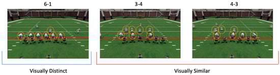 Standard formations used in the experiment. Left (blue underline): A 6-1 formation, which represents the visually distinct category, had six white players on the line of scrimmage (red line) and one player lined up behind them. Middle and Right (red underline): A 3-4 or 4-3 formation, which represent the visually similar categories, had three players (3-4) or 4 players (4-3) on the line of scrimmage (red line) and either four players (3-4) or 3 players (4-3) lined up behind them. The position of the green players did not vary significantly between formations.