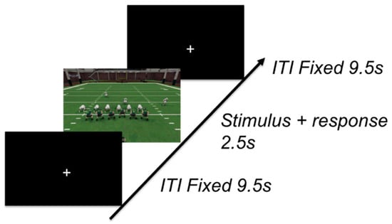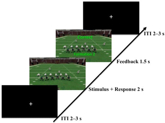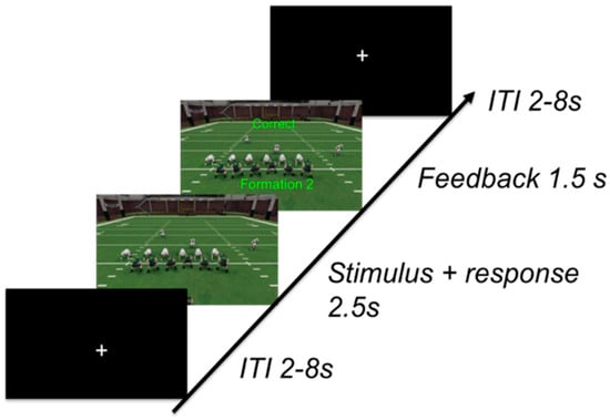 Every category had three separate formations, each sharing the defining number of players on the line of scrimmage for that category, for a total of nine formations used throughout the experiment. On each training trial, the subjects were shown a random formation for 2.5 s and were tasked with pressing a button on a keypad to place the formation into one of the three categories during the 2 s window (Figure 2). Corrective feedback was given to the subject immediately after making their response and it was on the screen for 1.5 s. The inter-trial-interval was optimized for event-related-design while using Optseq2 software and varied between 2 and 8 s []. Each formation was shown six times during each training block and there were six total training blocks.