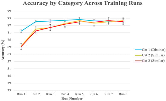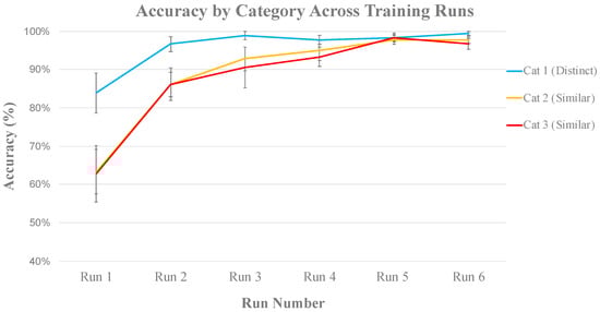 Data from one participant were excluded due to noise caused by motion during scanning, leaving 10 out of the 11 subjects for analysis. Figure 4 shows the average classification accuracy for each category across the six training runs. Visual inspection indicates that participants learned the visually distinct category faster when compared to the two visually similar categories, but by the end of run 4 they were able to accurately identify members of all categories.
