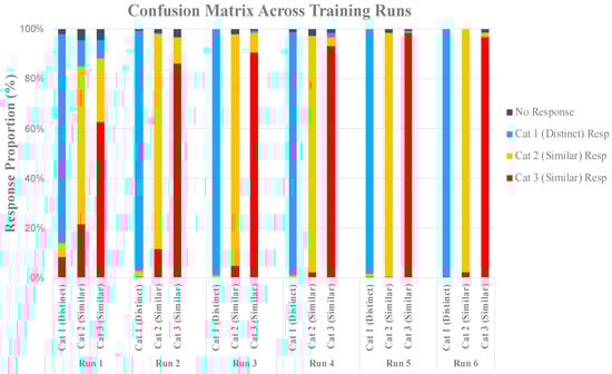 Visualization of the confusion matrix during classification. During the first 3 training blocks, subjects commonly confused the two visually similar categories for one another. By run 4, subjects were able to accurately dissociate between these two categories. Subjects rarely confused any other category when classifying formations in the visually distinct category.