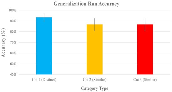 The generalization run was included to test for the hallmark of category knowledge—the ability to generalize category labels to novel category examples. On average, the subjects completed the generalization run with 92% accuracy for the visually distinct category and 88% accuracy for the visually similar categories (Figure 6). Had subjects been relying on the declarative recall of individual stimuli throughout training, their performance in the generalization run would have been closer to chance (33%).