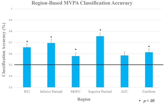 The inferior frontal gyrus (IFG), inferior parietal cortex, medial orbitofrontal cortex (MOFC), superior parietal cortex, and fusiform gyrus were able to classify between our two conditions with significantly above-chance accuracy. Amongst these regions, the superior and inferior parietal cortices provided the most reliable classification. The Anterior Cingulate Cortex (ACC) did not reach statistical significance.