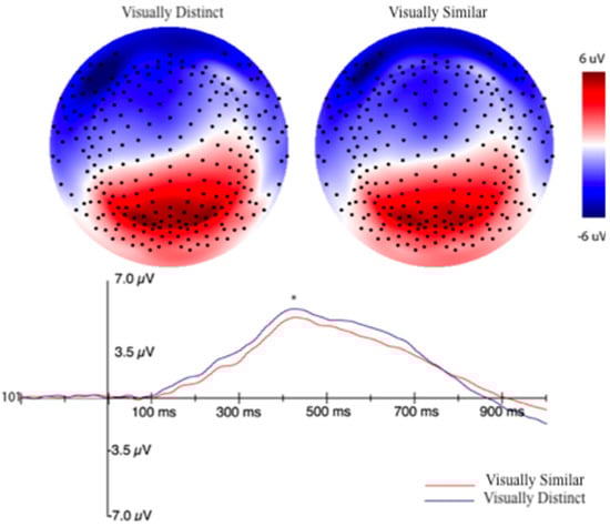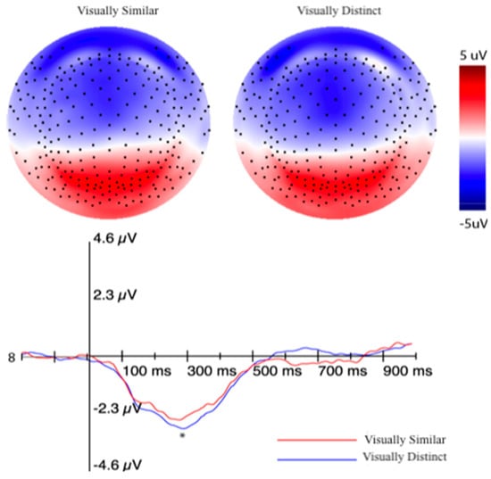 Top: A voltage map displays the voltage across the scalp for the similar and distinct conditions at the peak of the MFN (asterisk in bottom waveform image). A stronger negative voltage is seen over the medial frontal areas for the visually distinct condition. Bottom: Representative waveform (i.e., a single channel over the middle of the negative scalp potential) showing the shape of the MFN for both conditions. This waveform was derived from the grand-average of all the analyzed subjects. The amplitude of the MFN is higher (more negative) for the visually distinct condition.