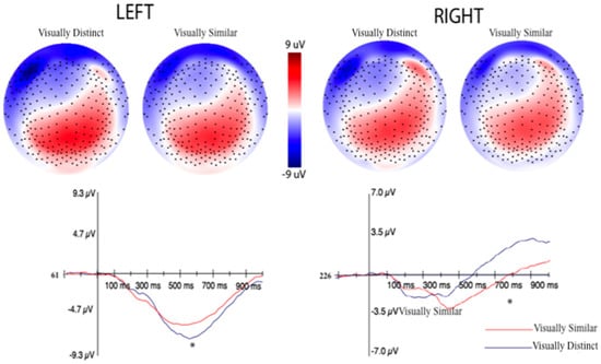The amplitude of the left LIAN was the largest for the visually distinct condition, whereas the right LIAN was largest for the visually similar condition, although the latter effect did not reach statistical significance. The left/right conditional flip makes the interpretation of this component fairly difficult. At this time, we are unsure whether both components are interpretable on their own, or if the LIAN is a hemisphere-specific component and the effect observed on the contralateral side is a byproduct of volume conduction. Luu et al. (2007) found that the amplitude of the right LIAN decreased as subjects acquired the ability to perform spatial analyses in a visuomotor association task, but the amplitude of the component remained unchanged when the targets in the task were digits that evoked the phonological loop []. They also found that the amplitude of the left LIAN increased as the subjects acquired digit targets in their task, whereas the amplitude remained unchanged as they acquired the ability to perform spatial analyses. Motivated by the findings of their experiment, we drew an initial assumption that the amplitude of both the left and right LIAN should be largest for visually similar condition in the current experiment. As similarly discussed in our interpretation of the P3b, however, this would only be the case if the subjects exclusively relied on perceptual similarity analyses to categorize formations in the visually distinct category—similar to the spatial analyses that were performed in Luu et al. (2007) [].