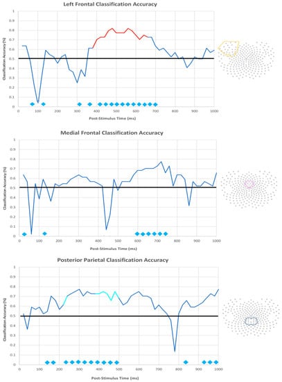 We ran a second machine learning analysis on only the voltages of single groups of electrodes in 20 ms intervals to understand which individual regions were driving the classification accuracy. Our results from this analysis showed that the medial prefrontal, left frontal, and posterior parietal regions collectively contributed to the earliest reliable classification point. fMRI studies using multi-voxel pattern analysis (MVPA) have consistently demonstrated that individual rules can be reliably decoded in frontal and parietal regions [,,]. Our EEG decoding results expand on these findings by specifying that the pattern representations of these concepts coincide with the initial orientation of attention. Through sufficient trial and error learning, the context under which an action is learned in a visuomotor task becomes tied to each individual stimulus in the task []. We can assume that the initial conscious registration of a stimulus prompted a conditioned re-establishment of the explicit rules (the learning context) that would dictate their subsequent action selection since we only analyzed trials after our subjects had been sufficiently trained on the task. This theory could explain why the first pattern dissociation between our two categories happens around the earliest time that a person can explicitly orient attention.