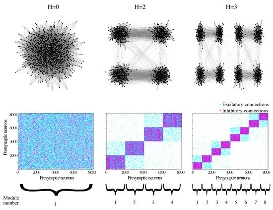 Figure 1. Examples of hierarchical modular networks of different hierarchical levels. (Upper row) Schematic representation of the network for H = 0, 2, and 3. In the figures, only networks with N = 2 11 and exclusively excitatory neurons were used for the ease of visualization and to highlight the intermodular connections. (Bottom row) Adjacency matrices for networks with N = 2 13 neurons (excitatory and inhibitory in the 4:1 ratio) and the same H levels as in the top row. Each dot represents a connection from a presynaptic neuron to a postsynaptic neuron. Blue dots represent excitatory neurons, and red dots represent inhibitory neurons. For each hierarchical level H, the module numbers are shown below the corresponding adjacency matrix.