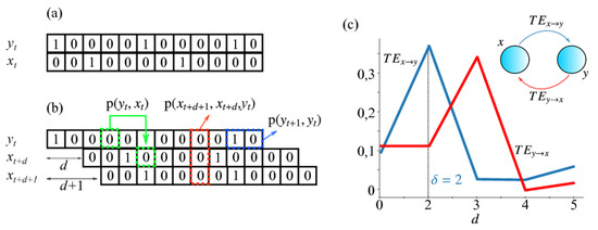 Since the value of the spike-train in each time step is either 0 (for silence) or 1 (for a spike), for the joint probabilities p ( x t , y t ) , we have 2 2 = 4 combinations, and for p ( x t + 1 + d , x t + d , y t ) , we have 2 3 = 8 combinations. In Figure 2, we summarize the procedure to measure T E y x explained above. In Figure 2a, the spike-trains were made in such a way that, whereas T E y x is maximum for d = 3 , T E x y is maximum for d = 2 . To illustrate that T E is maximized when the delay is equal to the time delay of the connection between two neurons and that this measure is asymmetric ( T E y x T E x y ), in Figure 2c, we plot T E y x and T E x y for a simple network of two coupled neurons. The system was artificially set up so that x fires three time steps after y and y fires two time steps after x. The delay for which T E is maximum can be interpreted not only as the time that information takes to go from y to x, but also as the time delay of a possible functional connection between the pair of neurons [46]. In fact, many studies use this approach to determine and retrieve the connectivity map of a network [47].