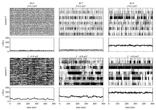 The network with H = 0 can have two types of asynchronous activity. In the case of week coupling (cf. H = 0 and J = 0.2 mV in Figure 3), neurons fire irregularly, and no synchronous behavior is observed. In addition, the population firing rate is low (the average value of r ( t ) for J = 0.2 mV is ν = 17.6 ± 5.6 Hz, where the ± sign means standard deviation) and homogeneous. As the synaptic strength increases (cf. H = 0 and J = 0.8 mV in Figure 3), the activity changes to a more heterogeneous behavior where single neurons fire in bursts of high activity interspersed with short periods of low activity, and the network firing rate displays a less homogeneous behavior with some irregular fluctuations. The mean firing rate also increases ( ν = 53.1 ± 12.5 Hz for J = 0.8 mV). Evidence of the fluctuations that appear when J is increased is the growth of the standard deviation of r ( t ) , which more than doubles when J changes from 0.2 mV to 0.8 mV.