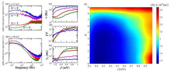 Figure 4. Increases of J and H cause amplification of slow fluctuations and enhance information transfer. (a) Spike-train power spectra computed for J = 0.2 mV and different values of H (indicated by different colors in the plot). (b) Same plot as in (a), but with J = 0.8 mV. (ce) Firing rate ν , Fano factor F F , and correlation time τ c for different values of J (H values indicated by the same colors as in (a,b). (f) Average transfer entropy (computed as in Equation (11)) in a two-dimensional diagram where the abscissa represents synaptic strength J and the ordinate represents hierarchical level H. Values of T E are indicated by the color bar to the right side.