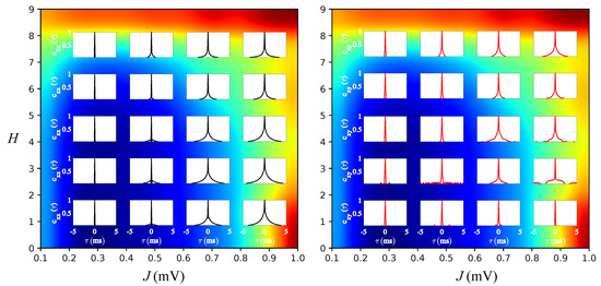 Figure 5. Spike-train autocorrelation c x x ( τ ) and cross-correlation c x y ( τ ) for selected pairs of parameters (H,J). Left: c x x . Right: c x y . The selected pairs (J,H) correspond to all possible combinations taken from the sets J = { 0.2 , 0.4 , 0.6 , 0.8 } and H = { 0 , 2 , 4 , 6 , 8 } . For better visualization, c x x and c x y for the pairs (J,H) are plotted over the plot of T E in the J-H diagram. The c x x is extracted from K = 10,000 randomly chosen neurons and the c x y from K = 10,000 randomly chosen pairs of neurons.