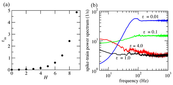 In Figure 4a–e, we present extended statistics that shed light on the effects of increasing J and H. Analysis of the spike-train power spectra in Figure 4a,b shows that an increase of either J or H leads to a build-up of slow fluctuations in the network. However, the effect is more pronounced for an increase in J than for an increase in H. For example, for fixed H = 0 , a change in J from 0.2 mV to 0.8 mV produces increases in power at low frequencies of about two orders of magnitude, whereas for fixed J = 0.2 mV, a change in H from zero to nine produces power increases at low-frequencies of about one order of magnitude. Overall, the spectral characteristics are similar to the ones of cortical neurons [51].