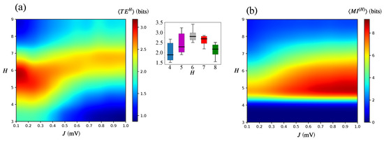 The boxplots in the inset of Figure 7a, which display the distributions of T E ( H ) for different H values and the entire range of J values, show that H = 6 has the highest mean and the lowest variance of T E ( H ) . This clearly shows that H = 6 is an optimized point for information transmission among modules.