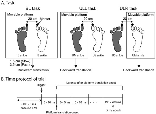 For the BL task, both feet were placed on the movable platform (Uchida Denshi, Hachioji city, Tokyo, Japan). Two unilateral tasks were performed, one with the left foot on the movable platform and the right foot on the non-movable platform (ULL), and the other with the right foot on the movable platform and the left foot on the non-movable platform (ULR) (Figure 1A). The heights of the movable and non-movable platforms were the same. To induce a forward perturbation to stance, the movable platform translated backward under two velocities, slow and fast. In the slow condition, the platform translated backward at a peak velocity of 40 cm/s, over a distance of 15 mm, with a duration of 75 ms, while in the fast condition, the peak velocity of translation was 91 cm/s, over a distance of 35 mm, with a duration of 80 ms.