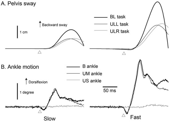 The averaged traces of the pelvis sway (A) and ankle motion (B) for one participant. Open triangles indicate the onset of platform translation. BL, the translation of both lower limbs, inducing ankle dorsiflexion bilaterally; ULL, unilateral left ankle dorsiflexion; ULR, unilateral right ankle dorsiflexion; B, bilateral ankle dorsiflexion in BL task; UM, dorsiflexion ankle in either the ULL or ULR task; US, stationary ankle in either the ULL or ULR task.