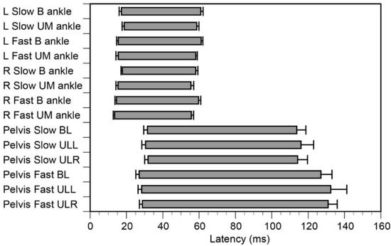 The onset and peak latencies of the ankle dorsiflexion and pelvis sway. Bars indicate the mean, and error bars indicate the standard errors of the mean. The left ends of the bars indicate the latency and the right ends of the bars indicate the peak latency. The top eight bars indicate the ankle motion, and the lower six bars indicate the pelvis sway. L, left; R, right; BL, bilateral; ULL, unilateral left ankle dorsiflexion; ULR; unilateral right ankle dorsiflexion; B, bilateral ankle dorsiflexion in the BL task; UM, dorsiflexion ankle in either the ULL or ULR task.