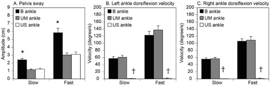 The amplitude of the pelvis sway (A), and the velocity of the ankle dorsiflexion (B, C). Bars indicate the mean, and error bars indicate the standard errors of the mean. (A) Asterisks indicate a greater amplitude in the BL compared with the ULL or ULR task on the multiple comparison test (p < 0.001). (B and C) Daggers indicate the lower velocity of dorsiflexion for the US than for the B or UM ankle on the multiple comparison test (p < 0.001). B, bilateral ankle dorsiflexion in BL task; UM, dorsiflexion ankle in either the ULL or ULR task; US, stationary ankle in either the ULL or ULR task.