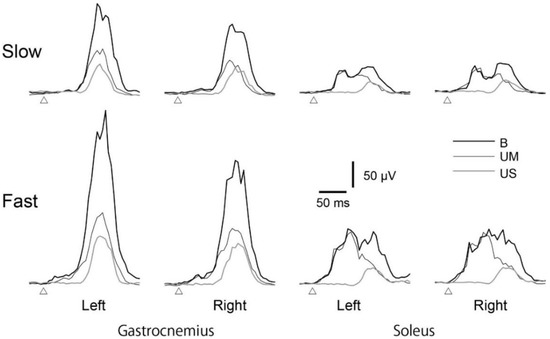 The contraction velocity of the gastrocnemius muscle is faster than that of the soleus muscle during walking [13]. The motor unit property and motor unit activity are different between the gastrocnemius and soleus muscles [14,15]. The vestibular contribution to the motor unit activity in the gastrocnemius muscle is greater than in the soleus muscle during postural tasks [16]. The gastrocnemius muscle contracts intermittently during postural tasks, while the soleus muscle contracts continuously [17]. Accordingly, there are physiological differences between the gastrocnemius and soleus muscles.