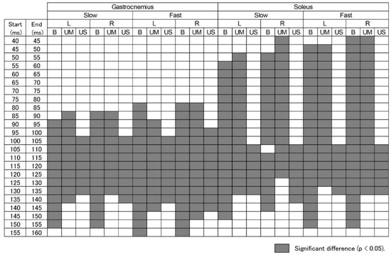 The specific time epochs where the EMG amplitude after the platform translation onset was significantly higher than the baseline EMG are summarized in Figure 6. For the gastrocnemius muscle, the EMG response, in which the amplitude was significantly higher than the baseline, began at 80–90 ms after the onset of the platform translation for the B and UM ankle, and at 95–100 ms after that for the US ankle (p < 0.05). The EMG response ended 155–160 ms after the onset of platform translation for the B ankles, and 135–150 ms for the UM and US ankles (p < 0.05). For the soleus muscle, the EMG response began 40–55 ms after the onset of platform translation for the B and UM ankles, and from 105 ms after that for the US ankle (p < 0.05). The EMG response ended 145–155 ms after the onset of platform translation for the B ankles, and 125–140 ms after that for the UM and US ankles (p < 0.05). There was no period in which the EMG amplitude after the onset of platform translation was significantly lower than the baseline EMG.