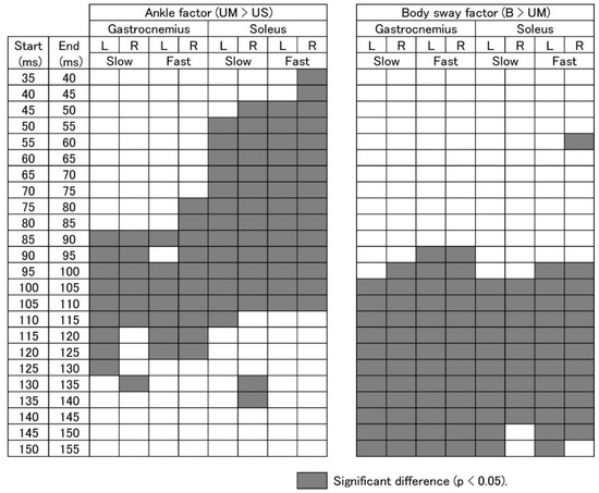 Results of the multiple comparison test for the ankle and body sway factors on the EMG response. The cells before the latency of 35 ms and after the latency of 155 ms are not presented, as there are no time epochs indicating a significant difference in those time windows. The ankle factor is present in the periods in which the EMG amplitude in the UM ankle was significantly higher than that in the US ankle. The body sway factor is present in the periods in which the EMG amplitude in the B ankles was significantly higher than that in the UM ankle. Filled cells indicate significant differences (p < 0.05). B, bilateral ankle dorsiflexion in the BL task; UM, dorsiflexion ankle in either the ULL or ULR task; US, stationary ankle in either the ULL or ULR task.