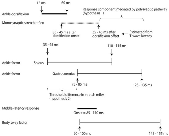 In the present study, we examined the precise time windows of the EMG response components in the ankle extensors triggered by the ankle motion and triggered by the pelvis sway above the ankle during the horizontal translation of the movable platform. Through estimating these precise time windows, the relationship between the EMG response components triggered by the particular source of the somatic sensation and the short- and middle-latency EMG responses, distinguished by the onset latency, were examined.