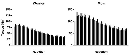 Peak torque of the right knee extensors for women (n = 10; left) and men (n = 10, right). The bars represent the mean ± SEM of the maximum torque achieved during the repetition. Note that the first two repetitions (light gray) were considered as adaptations and were not included in the fatigue index calculation.
