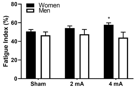 Fatigue index of the right knee extensors, stratified by transcranial direct current stimulation (tDCS) condition and sex. Data are mean ± SEM. * indicates 4 mA condition in women significantly greater than the 4 mA condition in men.