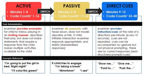 Two evaluators are required to administer the ASIEP-3 Interaction Assessment. The first adult interacts with the child across three different interaction conditions, which are each four minutes in length, while the second adult video records the interaction and provides cues on when to switch phases. The interaction includes three different conditions of four minutes each that are always administered in the same order: the active modeling phase (basic parallel play modelled by the examiner), the passive phase (the withdrawal of engagement and attention by the examiner), and the direct cues phase (the examiner gives specific directives during standardized time intervals). Prior to administration, information related to the participant’s cognitive level and expressive and receptive communication skills is reviewed, so the examiner is prepared to use developmentally appropriate language. Inappropriate play materials or verbal interactions that are too complex for the participant may confound the assessment results. The interactions between the examiner and the participant involve developmentally appropriate toys and activities selected from a standard menu developed for the study through the use of the Interest Inventory described below.