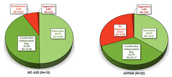 Autism. ASIEP scores were examined based on a clinical autism diagnosis (see Figure 3). Among those with an autism diagnosis (FXS+ASD N = 22), the average percentages of Interaction scores were significantly lower (M(22) = 34.8% versus M(15) = 49.9%, p = 0.002), and the No Response scores were significantly higher (M(22) = 29.5% versus M(15) = 7.6%, p < 0.001), compared to those with FXS−ASD. Therefore, while the FXS-ASD group earned half of their total score in the Interaction category, those with FXS+ASD earned just over one-third of their scores in the Interaction category. Furthermore, the FXS−ASD group had very low No Response scores (M(15) = 7.6%) compared to the FXS+ASD group who earned one-third of their codes in the No Response category (M(22) = 29.6%). Constructive Independent Play and Aggressive scores were not significantly different based on autism diagnosis (all p > 0.10).
