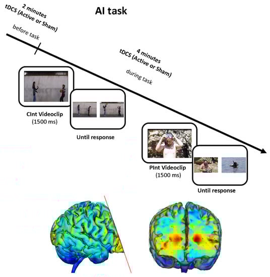 Experimental design and current flow model for transcranial Direct Current Stimulation (tDCS) application. In the Attribution of Intentions (AI) task, a short video was played, and the participant was asked to choose the picture representing a logical story ending by pushing one of the two buttons on the button box. One example for each stimulus condition (Communicative Intention (CInt) and Private Intention (PInt)) is displayed. Active or sham tDCS was started two minutes before the beginning of the experimental task and continued throughout the AI task. We utilized two 7 cm × 5 cm sponge pads and the current flow model is represented in the transverse view and 3D view on Male 1 model in Soterix HD Targets software (Soterix Medical, New York, NY, USA). The Soterix HD Targets software program is a simple tool to visualize current flow through the head, determined by the selected montage. For current flow calculation, we selected a uniform distribution over all electrodes because it leads to the most robust results, with an error of no more than 6%.