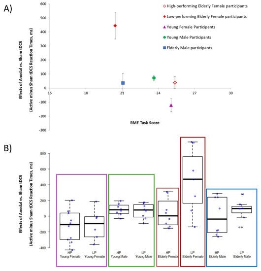 Panel A shows mean active transcranial Direct Current Stimulation (tDCS) effects in the Theory of Mind (ToM) task and the errors bars indicate mean standard errors. Panel B displays the distribution of Reading the Mind in the Eyes (RME) raw scores using boxplots. Blue points represent the single participant raw scores. HP = high-performing; LP = low-performing. The elderly female group was split into high- and low-performing subgroups based on the median value obtained during the RME task and exhibited differences in the active tDCS effects in the ToM task. In particular, higher tDCS effects were evident in elderly female participants with lower RME performances, whereas elderly female participants with higher performances showed lower active tDCS effects. Moreover, a comparison of these two elderly female subgroups with previously reported young female individuals [27] showed that high-performing elderly female individuals had an RME task score similar to that obtained by young female individuals, reporting a trend for a different effect of active tDCS. Otherwise, low-performing elderly female individuals showed a significantly lower RME task score and a different effect from active tDCS compared to young female individuals.