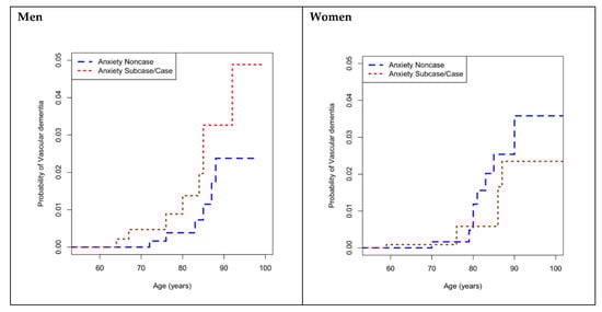 Vascular dementia may be the result of a single strategic infarct, multiple cortical or lacunar infarcts, or microvascular insults to regions of the brain critical for cognitive function []. Most studies have suggested that both the prevalence and incidence of VaD [,,] as well as the frequency of vascular risk factors for VaD (atrial fibrillation, heart failure, high blood pressure, atherosclerosis, obesity, and diabetes), are higher in men when than in women []. Therefore, it might be argued that this increased vulnerability to VaD among men might have significantly influenced the main findings in this study, namely, the increased incidence of VaD and the increased risk of VaD among anxiety cases in men. However, as we carefully controlled for vascular risk factors, our results suggest that anxiety could be an independent risk factor.