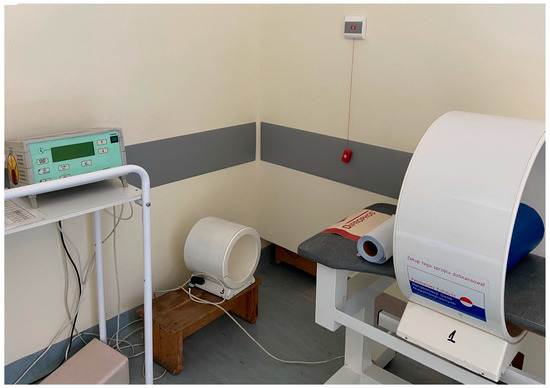 Magnetronic MF10 generator (EiE Elektronika i Elektromedycyna, Otwock, Poland) was used to generate ELF-EMF with the following parameters: magnetic induction—5 mT, frequency—40 Hz, wave forms—rectangular, bipolar, time of session—30 min, and exposed area—pelvic girdle (Figure 1). In this research, a coil applicator with five layers of 187 turns of 1.45 mm twin-parallel wires was used with the following parameters: length—270 mm and diameter—550 mm. ELF-EMF intensity inside the solenoid was nonequivalent. The induction coils of the generator were assembled horizontally, while apportionment of ELF-EMF was vertical. The established value of magnetic induction of 5 mT was located in the applicator geometrical center, whereas, with the proximity of the coil surface, the change of ELF-EMF intensity increased by around plus 1.4. The computer system controlled ELF-EMF itself. Post-stroke patients were exposed in 10 standard sessions, five times per week for two weeks. All subjects were placed in applicator, but only patients in the ELF-EMF group were exposed to ELF-EMF, and patients in the non-ELF-EMF group were given sham exposures. The sham exposure was obtained by setting, but not turning on the device.