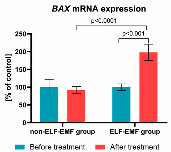 Comparison of the BAX mRNA expression acquired from the study group vs. control. Results formulated as parameter changes before and after therapy (100% expressed for the level of BAX mRNA expression in each patient sample before treatment). Statistical significance between ELF-EMF and non-ELF-EMF groups after 10 sessions amount to p < 0.0001.