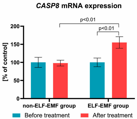 Comparison of the CASP8 mRNA expression acquired from the study group vs. control group. Results formulated as parameter changes before and after therapy (100% expressed for the level of CASP8 mRNA expression in each patient sample before treatment). Statistical significance between ELF-EMF and non-ELF-EMF groups after 10 sessions amount to p < 0.01.