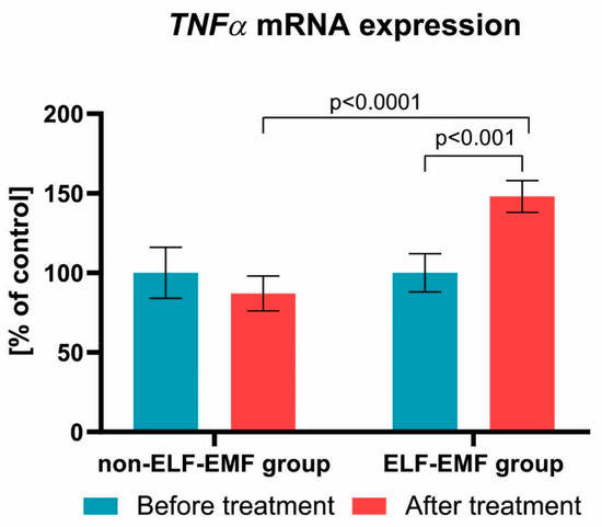 Comparison of the TNFα mRNA expression acquired from the study group vs. control group. Results formulated as parameter changes before and after therapy (100% expressed for the level of TNFα mRNA expression in each patient sample before treatment). Statistical significance between ELF-EMF and non-ELF-EMF groups after 10 sessions amount to p < 0.0001.