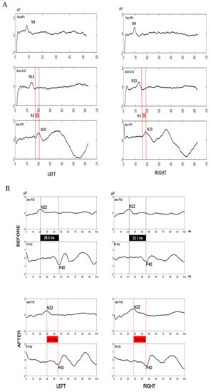 Somatosensory evoked potentials. (A). Somatosensory evoked potentials of upper limbs. Central conduction time upper limit in our laboratory: 6.2 ms. N9: brachial plexus somatosensory potential (upper limit in our laboratory: 11.6 ms). N13: spinal somatosensory potential (upper limit in our laboratory: 15.8 ms). N20: cortical somatosensory potential (upper limit in our laboratory: 21.6 ms). Fpz: forehead recording scalp electrode. Epc: Erb’s point dermal electrode. Glot: glottis dermal electrode. Cv5: spine of fifth cervical vertebra dermal electrode. Ear: auricular dermal electrode. CPi: centroparietal recording scalp electrode. All values were within the normal range before and after immunosuppressive therapy. (B). Somatosensory evoked potentials of lower limbs before and after corticosteroids. Somatosensory evoked potentials traces were displayed for left and right lower limbs. Please note the pathological values of the central conduction time (black boxes) before corticosteroids (upper traces) and their reduction and normalization (red boxes) after corticosteroids (lower traces). Furthermore, N22 latencies are normal before and pathological after corticosteroids. These data suggest that the dorsal column damage precedes the development of peripheral neuropathy and regress after immunomodulatory therapy. Central conduction time upper limit in our laboratory: 21.3 ms. N22 upper limit in our laboratory: 25.8 ms. N22: spinal somatosensory potential. P40: cortical somatosensory potential. Um: umbilicus dermal electrode. T12: spine of 12nd thoracic vertebra dermal electrode. Fz: fronto-median recording scalp electrode. Cz: centro-median recording scalp electrode.
