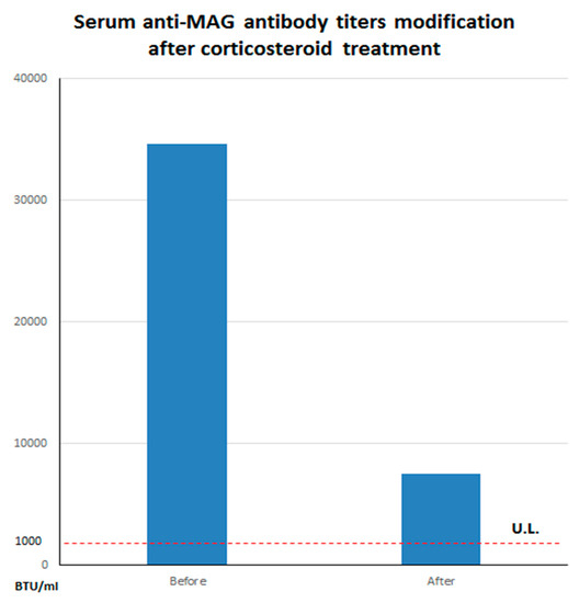 Serum anti-myelin associated glycoprotein (anti-MAG) titers modification after corticosteroid treatment. Please note the substantial decrease of serum antibody levels before (34,594 BTU/mL) and after (7520 BTU/mL) corticosteroid treatment. The dashed line refers to the upper limits (U.L.) of normal for our laboratory (~1000 BTU/mL).