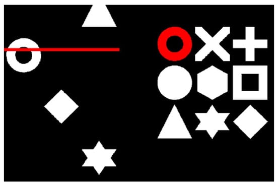 The Swansea Test of Attentional Control (STAC) task. A target is identified within the 3 × 3 matrix of symbols (right). When a matching symbol appears amongst the three columns of the search array that scroll up the screen (left), participants press the spacebar as the symbol crosses behind the red line (as depicted in Hanley and Tales, 2019, []).