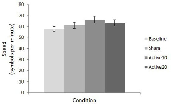 STAC final speed. Mean speed values for all conditions (baseline, sham, Active10, Active20) illustrate superior task performance following 10 min of anodal tDCS. Error bars represent ±1 standard error.