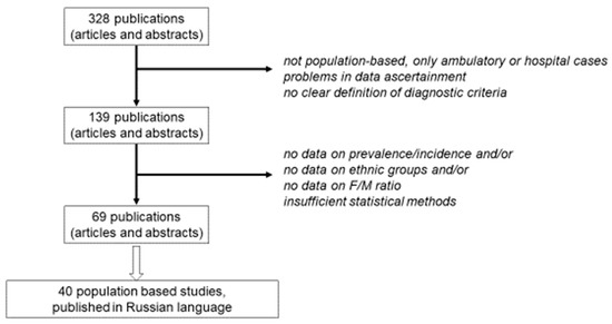 According to the All-Russian National Bibliography, 328 articles on the clinical epidemiology of MS in the Russian Federation were published from 1988 up to now, including data collected from the late 1980s to 2018. All articles and abstracts were in Russian and mainly based on hospital cases, or had some problems in the calculation of widely used epidemiological indexes. The majority of studies used Poser criteria for MS diagnosis; only McDonald criteria of the last 10 years were dominating [5,6]. We selected the most qualified studies performed during this period, using these diagnostic criteria of MS, validated in Russia [7]. One hundred and thirty-nine publications were selected, some of which did not contain sufficient data. Finally, only 69 articles and theses with data from 40 studies (some of them in dynamics) were finally included in this review (Figure 1). We used only the average annual rates of prevalence and incidence rate among these populations at different time periods.