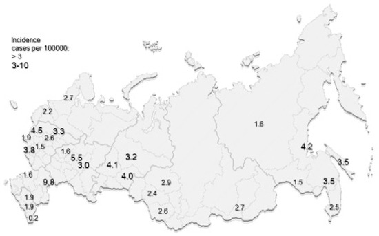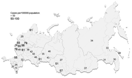 In the South-Western Bryansk Region, the prevalence of MS increased from 40.6 cases in 2004–2008 to 48.1 cases per 100,000 population in 2012–2016. The average incidence rate in 2012–2016 was 1.9 cases, and F/M ratio—3.0 [26,27]. In the city of Orel, the prevalence of MS for the year 1995–2000 was 40.4 cases, incidence—1.45 cases per 100,000 population [28]. In the Kursk Region, the epidemiological study in 2015 showed a relatively high MS prevalence, with an average rate of 78.4 cases per 100,000 population (89.2 for towns and 63.2 for rural areas). The highest rates were in the towns of Sudzha (157.3) and Shigry (154.1), the lowest in Kurchatov (21.5) and Timskyi (26.7 cases per 100,000 population) rural districts [29]. In another study in the city of Kursk, the authors obtained similar indexes—the annual MS prevalence was 70.8 cases and incidence was 3.75 cases per 100,000 population [30].