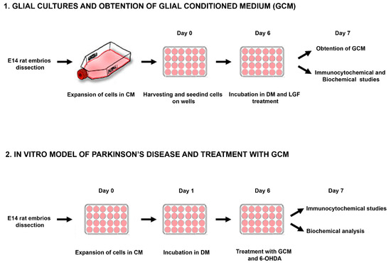 Cells obtained from the midbrain of embryos (E14) were kept for 3–6 passages in CM, which promoted the growth of the glial population of the culture. Every 5–6 days, the medium was replaced. To obtain the GCM, the whole medium was discarded, and cells were washed 3 times with medium Leibovitz’s L15 to remove the rest of the serum, as described in [41] (Figure 1). Next, the cells were maintained in DM EF12 without serum for 24 h. Then, the medium was collected and frozen at −80 °C.