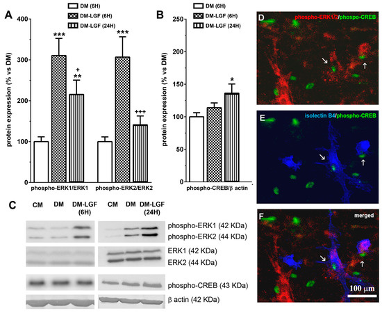 Effects of LGF on ERK1/2 and CREB phosphorylation in cultured mesencephalic glia. (A) shows the effect of LGF on phospho-ERK1/ERK1 and phospho-ERK2/ERK2 ratios in mesencephalic glia maintained in a DM (white bar) (A) and in a defined medium with LGF (DM and LGF) for 6 (dots bar) or 24 h (black bar). Note how LGF increased the phospho-ERK1/ERK1 ratio at both experimental times. (B) shows the effect of LGF treatment in phospho-CREB protein expression in DM (white bar) and in a defined medium with LGF (DM and LGF) for 6 (dots bar) or 24 h (vertical black lines bar). Note how LGF treatment for 24 h significantly increased phospho-CREB levels. (C) shows representative bands of phospho-ERK1/2, ERK1/2, phospho-CREB, and β-actin. Note how ERK1/2 protein levels are unchanged under all experimental conditions. (D–F) show how some phospho-CREB-positive cells—(D–F) in green—were also immunopositive for phospho-ERK1/2 (D) (red) and isolectin IB4 (E) (blue), as well as how a few isolectin IB4-positive cells were phospho-ERK1/2- and phospho-CREB-positive too (F). Results in (A,B) represent the mean ± SEM of 5–9 independent experiments. * p ≤ 0.05, ** p ≤ 0.01, *** p ≤ 0.001 vs. DM, + p ≤ 0.05, +++ p ≤ 0.001 vs. 6 h DM and LGF (ANOVA and Newman–Keuls). In (C), lane 1 and 4: CM; lane 2 and 5: DM; lane 3: DM and LGF (6 h); and lane 6: DM and LGF (24 h). Scale bar 100 µm.